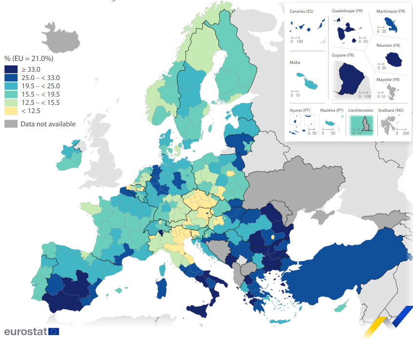 Calabria, Campania e… Guyana francese. Sono le regioni in Europa con i tassi più alti di rischio poverà o esclusione sociale. I dati sono stati diffusi da Eurostat e sono relativi al 2024. Dopo la Guyana francese (59,5%), la Calabria registra un tasso di vulnerabilità del 48,8%, seguita dalla città autonoma spagnola di Melilla (44,5%) e dalla Campania (43,5%).