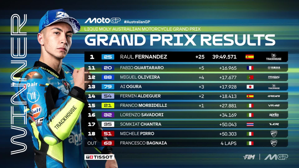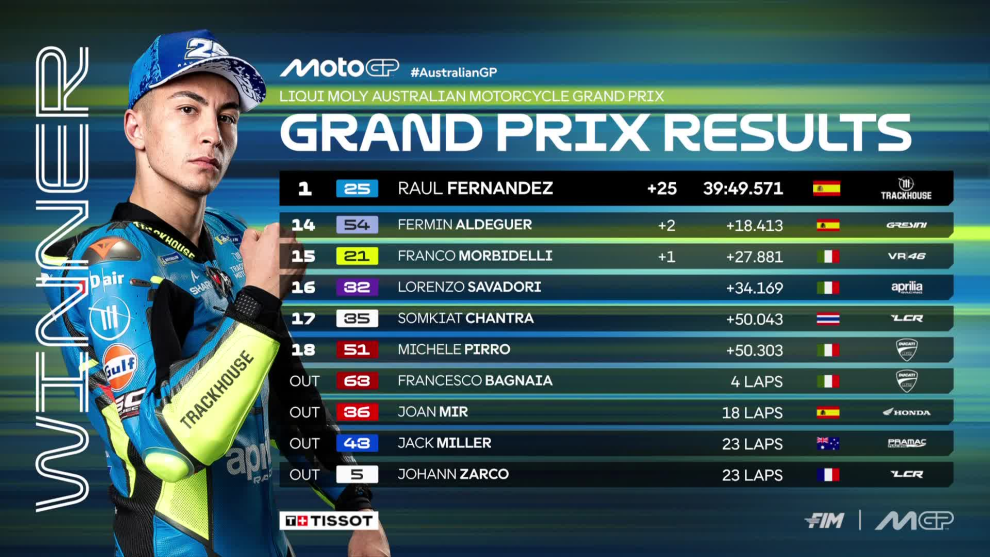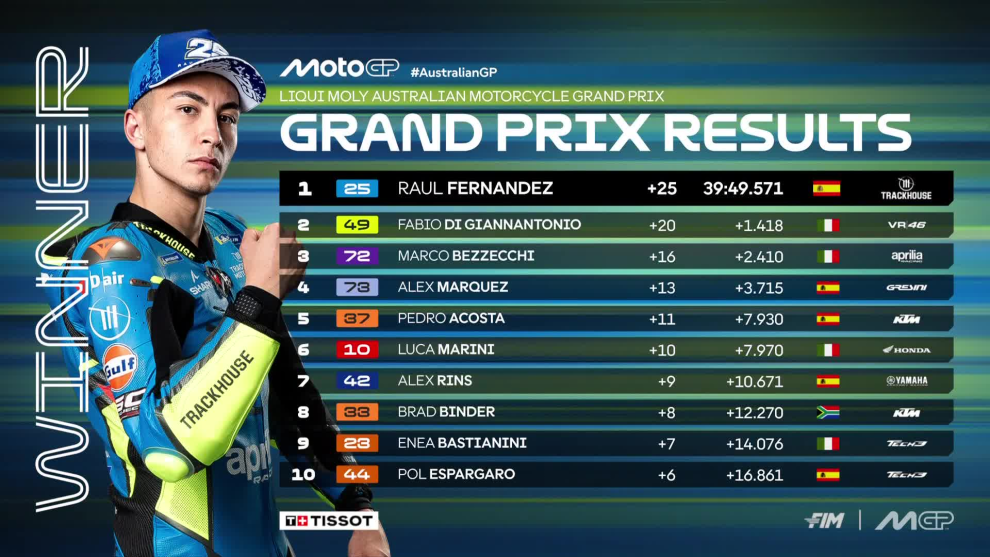 Prima vittoria in MotoGP per Raul Fernandez. Il pilota Aprilia Trackhouse ha sfruttato i long lap penalty di Marco Bezzecchi per sbloccarsi nella classe regina vincendo per distacco davanti a Fabio Di Giannantonio e a Bezzecchi.