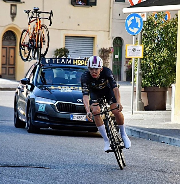 “Alla Coppa Mobilio noi del Team Hopplà ci tenevamo a vincerla – racconta Manenti – io ero molto controllato e non sono riuscito ad entrare nella fuga giusta. Però c’erano davanti due compagni di squadra ed eravamo tranquilli, tanto è vero che poi ha vinto Regnanti. I primi 15 in linea al pomeriggio facevano la cronometro e quindi ho vinto la volata del gruppo piazzandomi 12° e centrando l’obiettivo. Mi sono preparato bene in settimana per la prova contro il tempo: ho chiesto e avuto dal team la bici per la crono e ho fatto più uscite per prepararmi al meglio e prendere feeling col nuovo mezzo. Ma se ho vinto a Ponsacco è merito principalmente di Claudio Lastrucci, il patron del Team Hooplà, che era in ammiraglia e mi ha seguito e incitato a gran voce per tutto il percorso. Lui ci credeva più di me! La condizione, anche se siamo a fine stagione, era più che buona, ho visto che le gambe giravano sin dal via, mi sono gestito come meglio potevo e anche se è stata una sofferenza vincere l’ultima corsa col presidente in ammiraglia è stato bellissimo. Ho capito di aver vinto quando ho raggiunto e superato due corridori che sono partiti prima di me, e l’intervallo era di 3’ a partenza. E’ davvero volata via la mia cronometro, mi hanno detto che ho fatto il nuovo record! Che dire? Sono strafelice per questa magica stagione. E lo sono perché ho tenuto una condizione sempre buona dall’inizio alla fine e andar forte anche a cronometro è un ulteriore segno di maturità”.