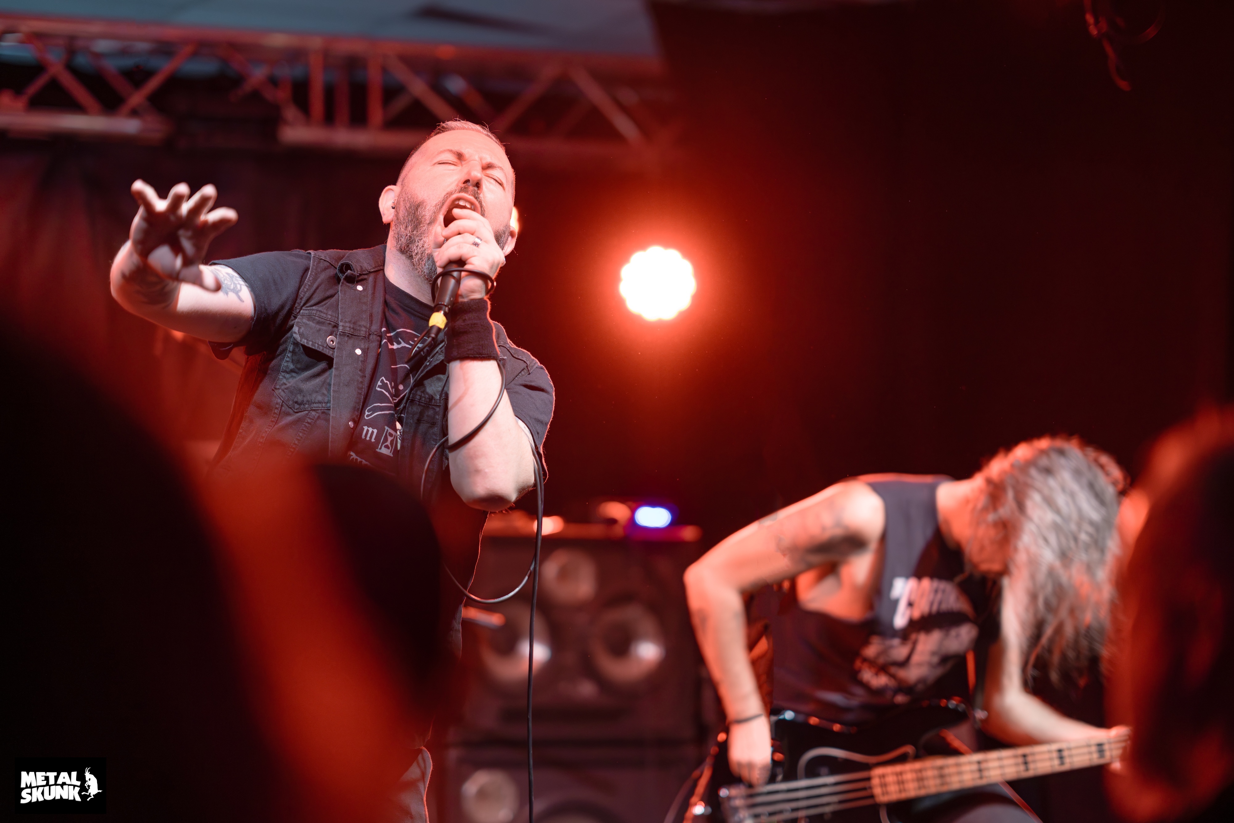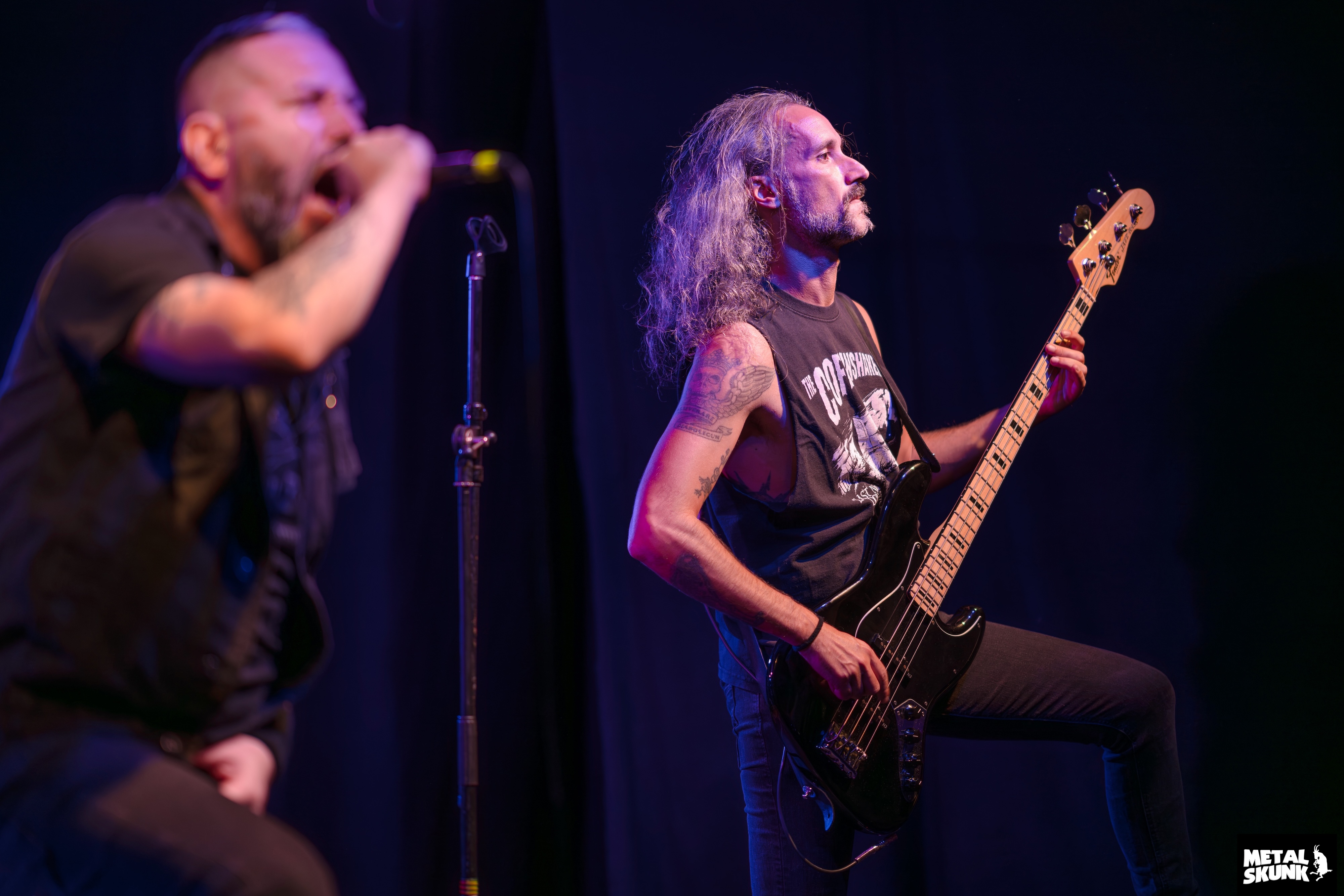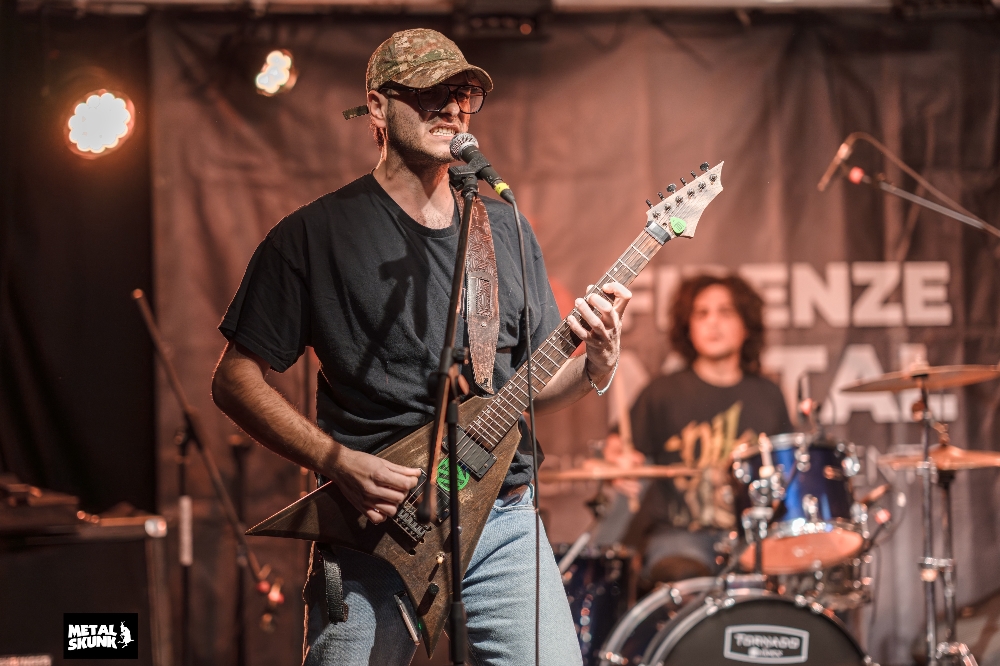 Gli ASHEN FIELDS sono stati, fra tutti, i più preparati tecnicamente. Sentitissime le presentazioni dei pezzi da parte del cantante, forse un po’ troppo dato il contesto, dati i presenti e il fatto che, in principio, si era ritrovato il microfono pressoché defunto. Gli Ashen Fields sono liguri come gli headliner che ascolteremo in conclusione, attivi da un bel pezzo, e alla prova del full solo nel 2025 con So Haggard and so Woe-Begone, e hanno proposto un death metal tecnico, a tratti epico, a tratti malinconico in un senso strettamente scandinavo. Funzionano meglio quando rallentano che quando accelerano, il muro di suono è totale, eppure i pezzi non mi hanno acchiappato particolarmente. Anche se, sarò sincero, sono un po’ curioso d’approfondire il disco, cui ho dato solo una rapida ripassata.