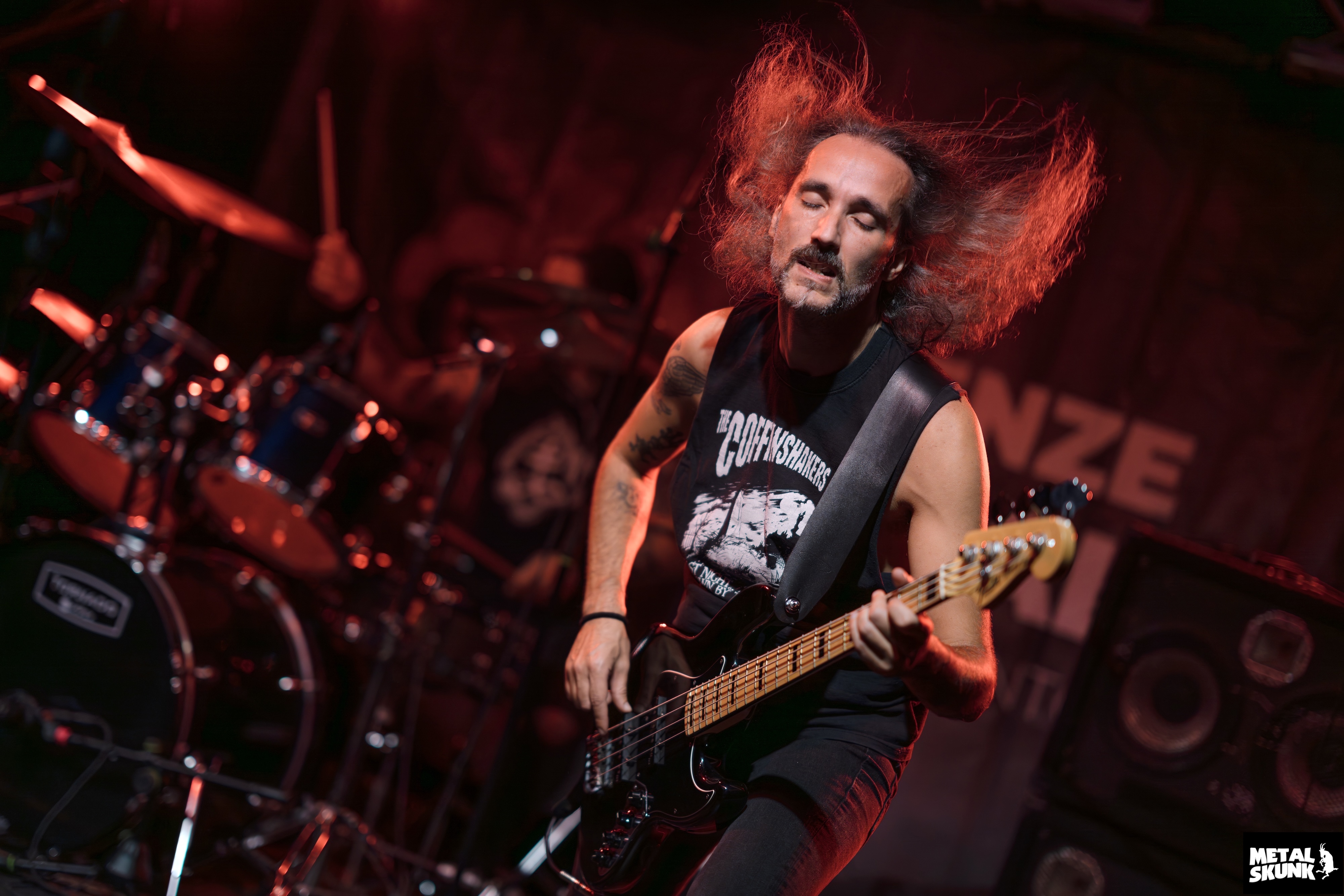 Il cantante Lorenzo Sassi ha anch’egli mostrato un’ottima presenza scenica; Gionata Potenti alla batteria spingeva come un dannato. Dei Frostmoon Eclipse mi ha colpito la cura strumentale delle singole composizioni, che è esattamente quello che ricordavo su disco, ma da pochi metri esce in maniera nitida e calda grazie all’ottima acustica dell’ex Cycle di Calenzano. Non mi ha colpito la longevità in corso d’opera: furiosi i primi dieci/quindici minuti, nella seconda metà del concerto ho come percepito un leggero calo, più che dalla loro parte, da quella dell’interesse generale del pubblico, spartito fra gente collassata sui divanetti, altra gente impegnata all’esterno in tornei di Warhammer con un tasso di umidità del novantotto percento, e quei due impegnati a infilarsi i Primex per comprovarne la vestibilità. Maniaci. (Marco Belardi)