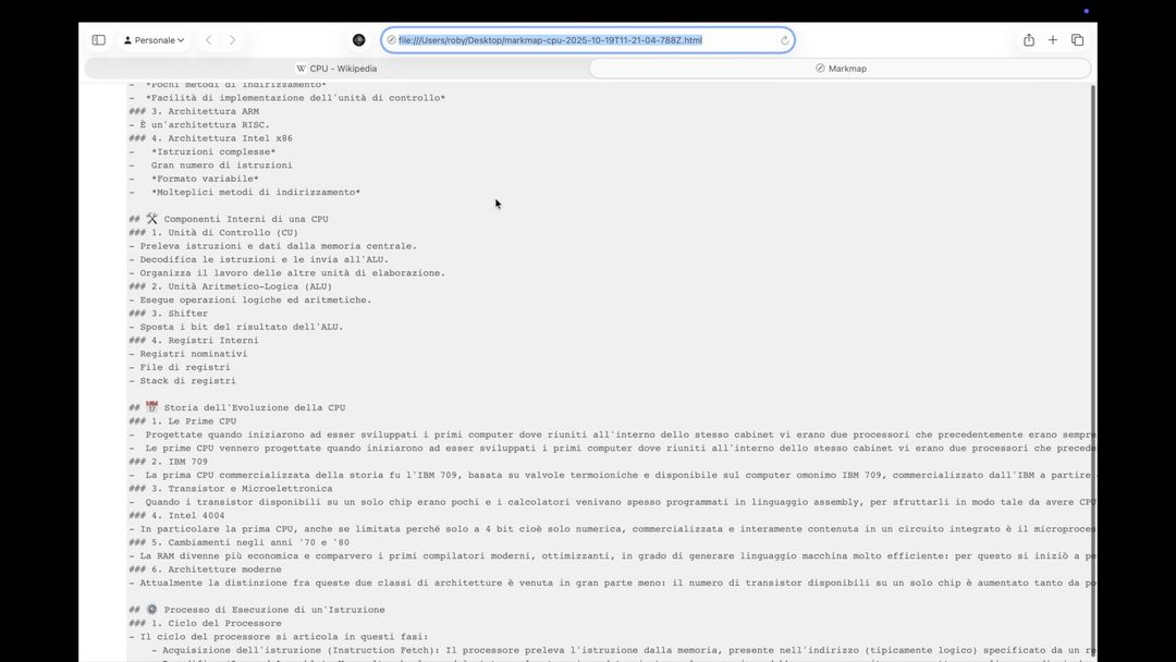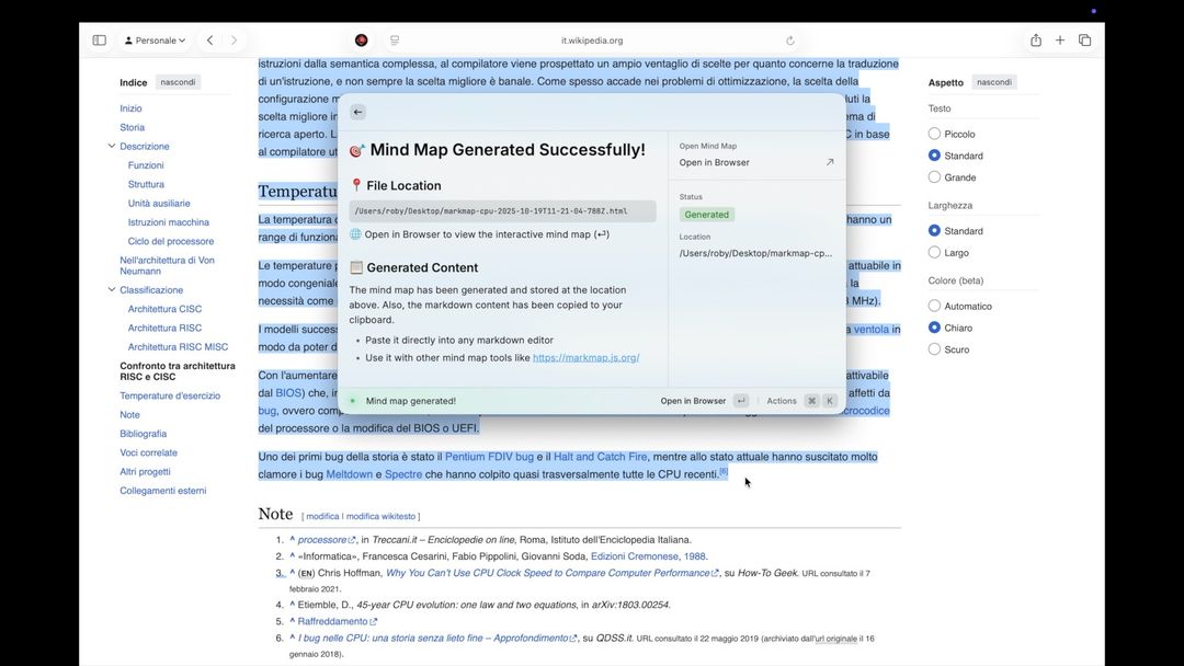 Volendo si può anche selezionare una parola e chiedere di spiegarla, una immagine chiedendo di cosa si tratta oppure un testo molto lungo e chiedere di generare una mappa mentale per lo studio. Queste, come si vede dalla schermata sotto, vengono generate in pochi secondi in locale e sono scaricabili anche in formato HTML.