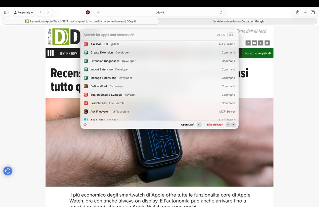 Raycast, questo il software, è un’app che sostituisce Spotlight: fa esattamente quello che può fare Spotlight, cercare documenti e app, ma oltre a questo fa decine di cose in più, tra le quali integrare una serie di comandi che utilizzano l’IA per lavorare su testo copiato negli appunti, tab del browser aperte, immagini a schermo e anche dati dei programmi tramite estensioni.