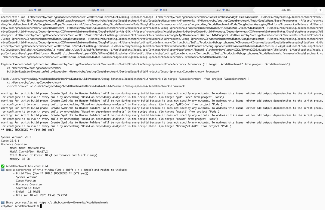 Il caso più comune di utilizzo della CPU con tutti i core al lavoro è la compilazione di un progetto: abbiamo usato il noto benchmark per XCode, che scarica e compila un progetto Xcode pesante e complesso e misura quanto tempo impiega il Mac a completare la compilazione.