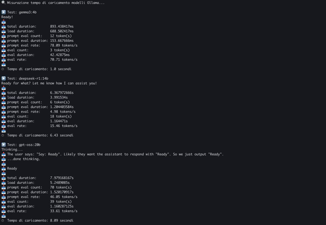 Abbiamo scritto un breve benchmark che misura il tempo di caricamento dei modelli: Gemma3 da 4 miliardi di parametri viene caricato in memoria in un secondo, per il modello open-weight di OpenAI, GPT-OSS da 20b servono 8 secondi. Da questo dipende anche la velocità di risposta del modello, il primo “token”.