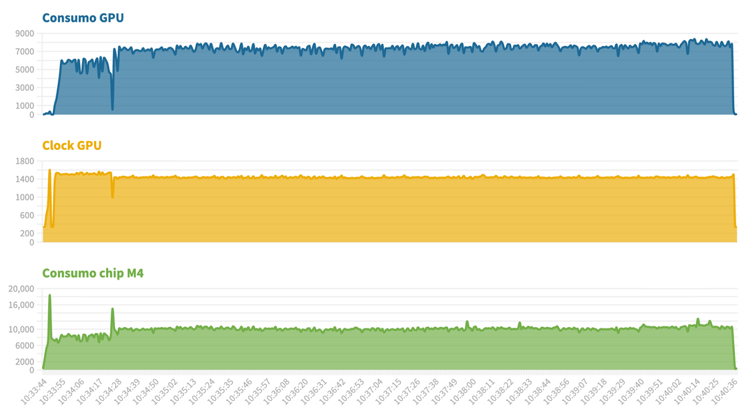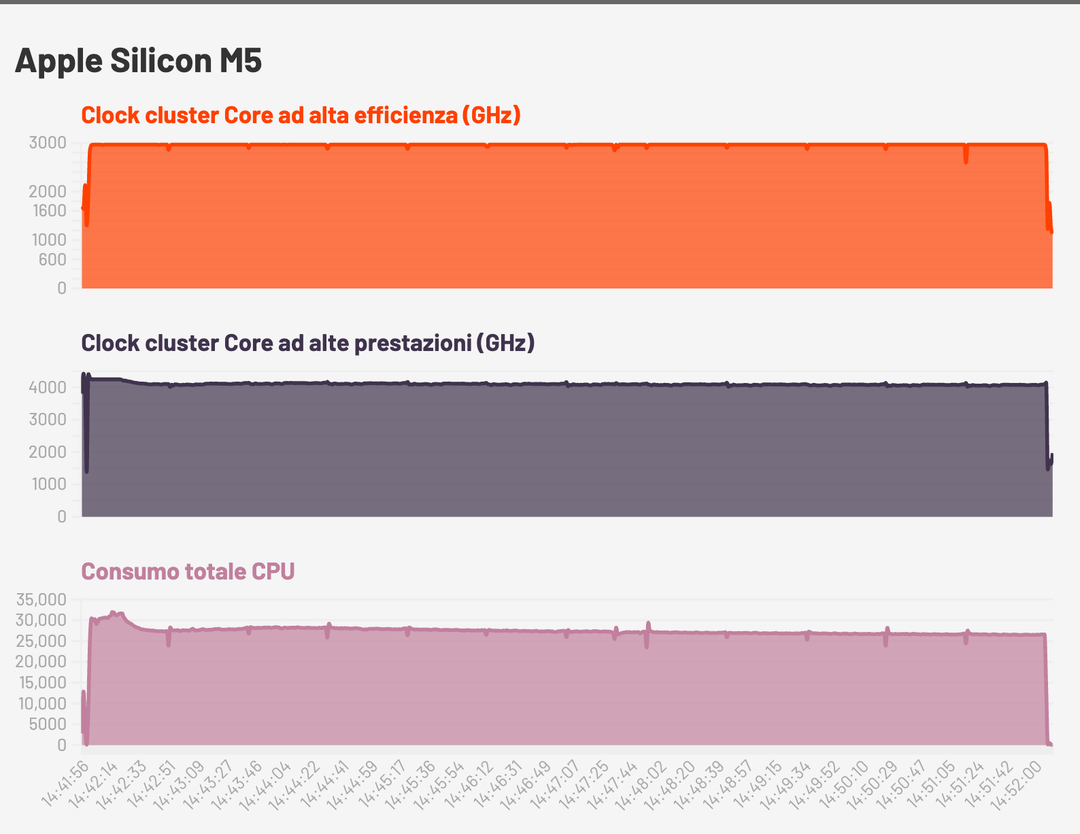 Come si può vedere M5 ha una frequenza di clock più alta, e ha anche una sorta di “turbo” iniziale con il clock che sale a 4.4 GHz per poi scendere. Il consumo iniziale, durante il boost, tocca i 30 Watt ma dopo pochi secondi scende e si assesta sui 27 Watt, questo per una riduzione della frequenza di clock che si stabilizza sui 4.1 GHz.