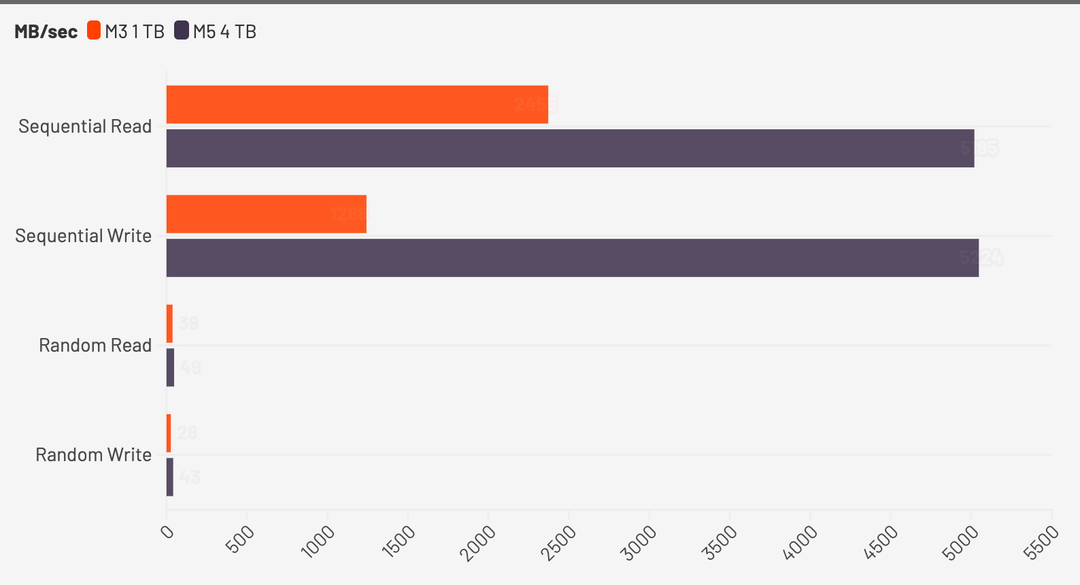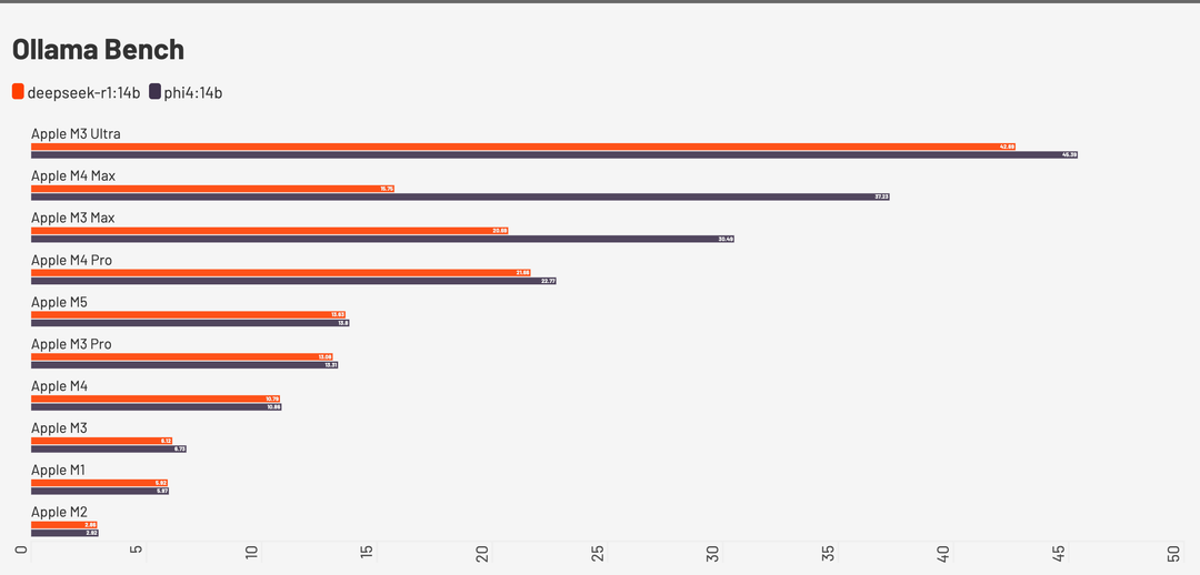Se guardiamo invece ai benchmark di diversi modelli open con Ollama M5, con 32 GB di RAM e una larghezza di banda di 153 GB/s, si posiziona come velocità di token generati al secondo allo stesso livello di M3 Pro, che ha un processore con 16 core GPU e ben 300 GB/sec di banda per le memorie, il bus è a 256 bit.