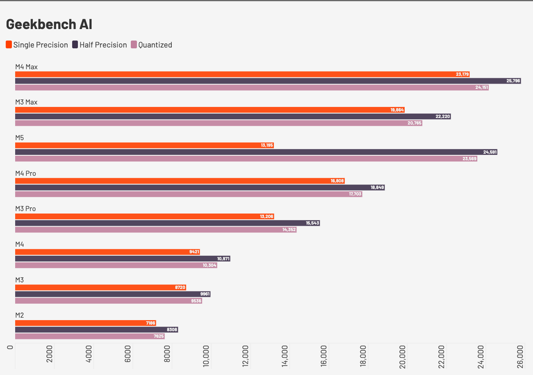 Trattandosi di un computer che deve fare soprattutto inference, il valore che più interessa è quello in INT8: quasi tutti i modelli distribuiti (es. mistral:7b, llama3:8b, phi3) sono in versioni quantizzate e qui M5 sfrutta le math units introdotte con la nuova generazione di GPU. La velocità guadagnata è impressionante, più del doppio rispetto ad M4 e vicino a M4 Max. Ricordiamo tuttavia che la memoria, e la banda, sono un collo di bottiglia per i modelli IA pertanto nonostante il benchmark mostri M4 Max e M5 vicini, M4 Max è un processore nettamente più veloce in ambito IA proprio per la banda di memoria, il bus e la quantità di memoria.
