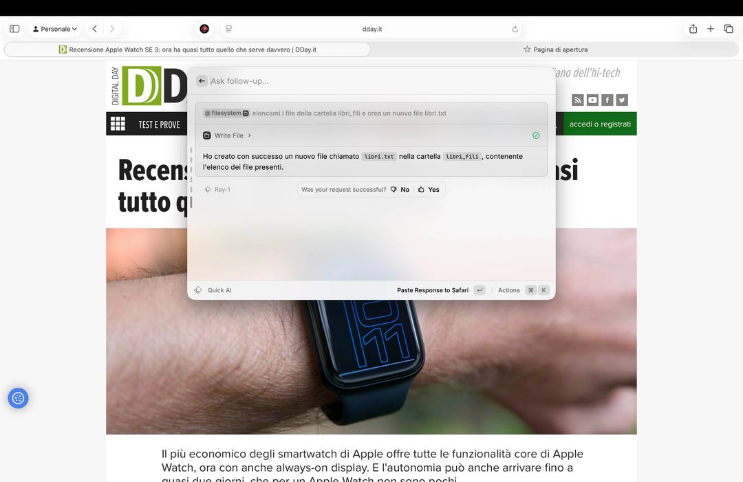 Successivamente abbiamo chiesto di creare un file di testo contenente l’elenco di questi libri formattandolo in un determinato modo e l’IA ha scritto il file, questo dopo averci chiesto il permesso finale per procedere alla scrittura. Impressionante.