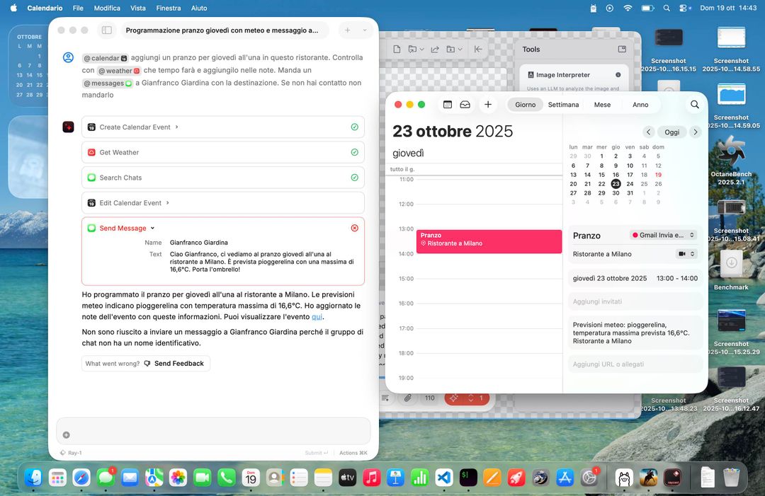 Non è finita qui, perché Raycast supporta anche MCP (Model Context Protocol), il protocollo creato da Anthropic che permette ai modelli IA di accedere a dati che non necessariamente risiedono sul computer, ma possono essere su server in cloud. Tramite MCP Raycast può ad esempio usare Blender, e abbiamo chiesto al chatbot di creare decine di oggetti 3D in una posizione specifica come gli abbiamo anche chiesto di leggere e scrivere file da Google Drive. MCP è la chiave che permetterà di creare agenti AI, dove i modelli si passano i dati in modo sicuro e protetto.