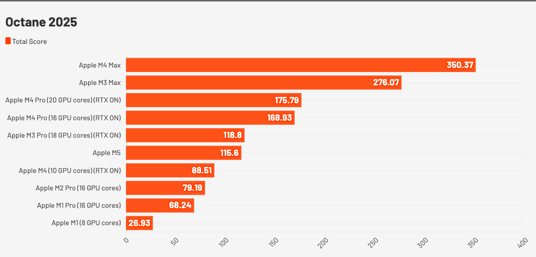 Ogni motore di rendering sfrutta il processore in modo diverso ed è anche ottimizzato diversamente, e Octane è tra tutti i motori quello che sfrutta meno le primitive di Metal.