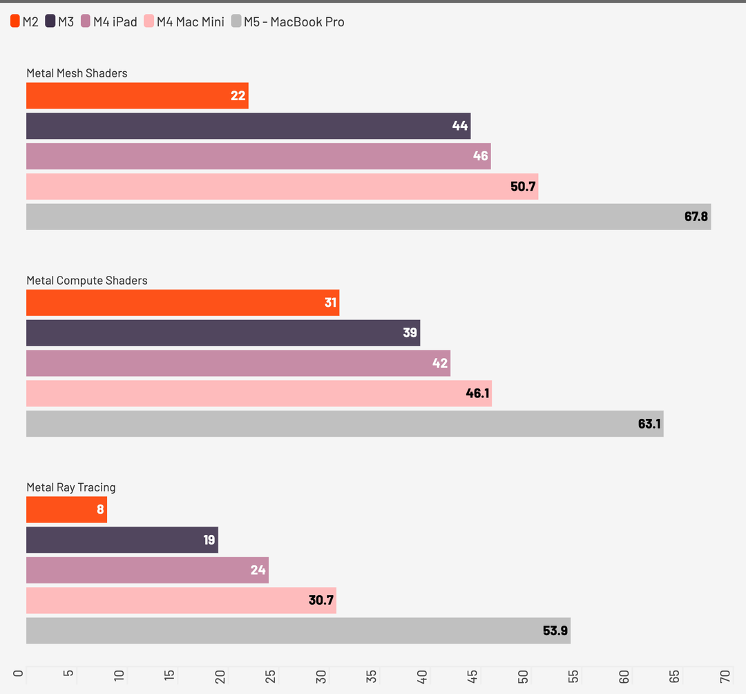 M5 sarà ricordato per essere il processore Apple Silicon con il più grande salto generazionale di sempre per quanto riguarda la GPU, ben più alto di quello che c’è stato da M2 a M3 quando Apple ha introdotto il mesh shading e il ray tracing.