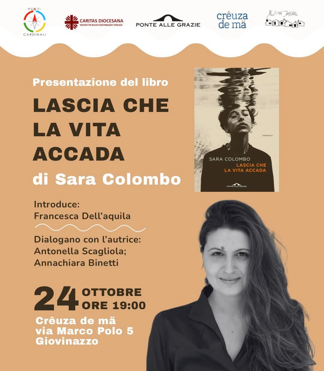 La Caritas diocesana, nell’ambito del Progetto Punti cardinali, rivolto ai giovani del territorio per sensibilizzare e conversare su temi legati al mondo giovanile, invita alla presentazione del libro Lascia che la vita accada, ed. Ponte alle grazie, romanzo d’esordio di Sara Colombo, venerdì 24 ottobre, alle ore 19, presso Crêuza de mä (via Marco Polo, 5 – Giovinazzo).