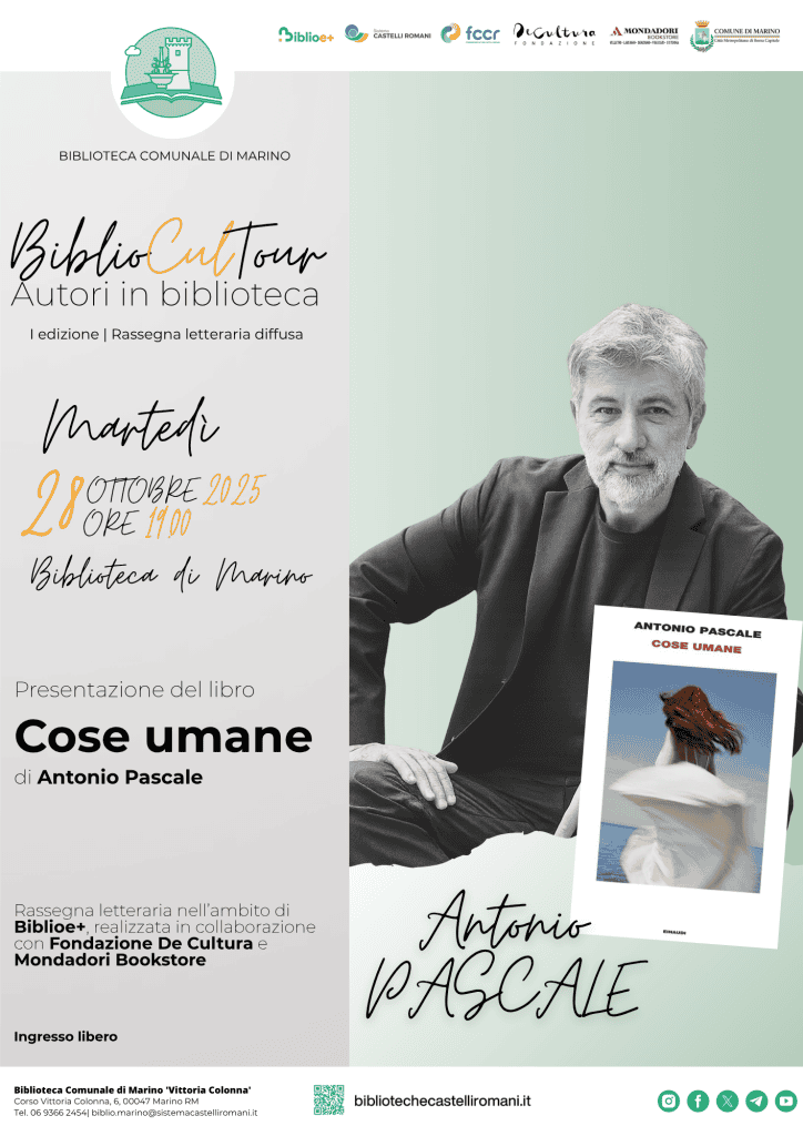 Restano ancora due date per godersi i libri e la letteratura in Biblioteca: Antonio Pascale con “Cose umane” (Einaudi) sarà il 28 ottobre, alle 19, a Marino. Con la sua irresistibile, scanzonata vena malinconica, l’autore percorre la distanza che ci separa da com’eravamo una volta per misurare chi siamo oggi, raccontando di genitori che invecchiano, di giovinezze sognanti, di amori che iniziano prestissimo, finiscono male o non finiscono mai. Dialogherà con lui Daniele Dibennardo.