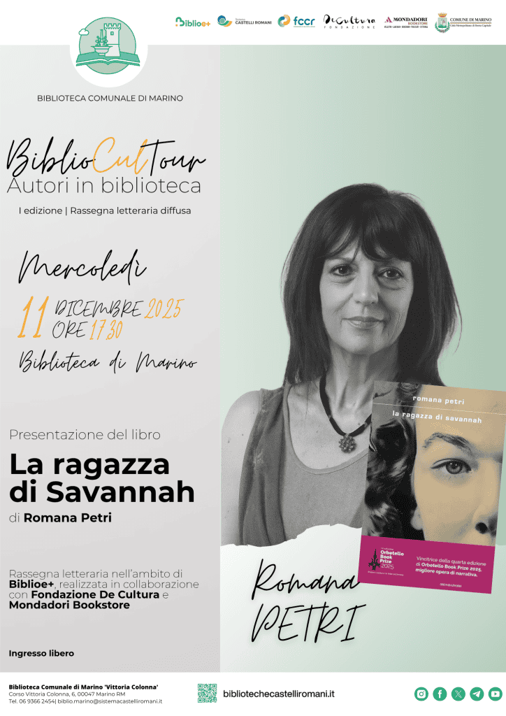 Gran finale a dicembre, l’11, con Romana Petri a Marino (ore 17.30). La scrittrice parlerà de “La ragazza di Savannah” (Mondadori), romanzo ispirato a Flannery O’Connor, una delle più grandi autrici del Novecento che entra nell’immaginazione di Romana Petri con i suoi umili e i suoi balordi, i suoi peccatori, la sua solitudine, lo splendore dei suoi pavoni e l’amore mai avuto.