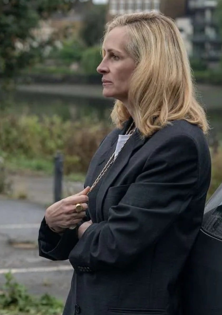 Ispirato ai power suit degli anni ’90 della stessa Roberts (si pensi ai blazer doppiopetto con spalle Armani e pantaloni a righine), i look di Alma diventano man mano sempre più difficili da decifrare: “È una donna upper-class, intelligente e pratica, che lavora in un mondo maschile. Ho bilanciato eleganza e casual daywear, con blazer e camicie button-down abbinate a jeans, ma senza cardigan comodi o abiti fluenti. Linee taglienti per trasmettere costrizione, sapendo che nasconde un segreto“, racconta Piersanti a ELLE. Man mano che la trama si infittisce – con Alma a un bivio tra lealtà e verità – il suo guardaroba si evolve. I blazer oversize e le camicie bianche cedono il passo a dettagli più cozy e leggeri, come a simboleggiare “che il segreto è emerso“, nota la costumista. I vestiti armano la protagonista contro le pressioni istituzionali, ma ne rivelano la vulnerabilità, trasformando il tailleur in metafora di una “power dressing” repressa.