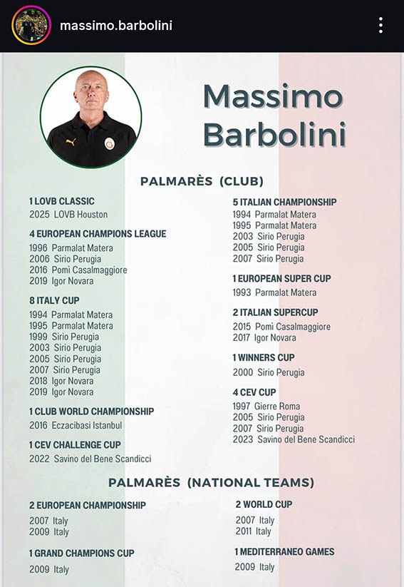 “Oggi ho deciso di chiudere il mio Instagram. Sono uno degli allenatori più vincenti nel mondo della pallavolo femminile, quindi potete immaginare come gestisco le critiche e i messaggi di persone nascoste dietro uno schermo. Su una scala da zero a dieci: zero! Ma non posso accettare che questo tipo di persone lo facciano sotto i miei post personali, ecco perché ho deciso di dire basta! “ ha scritto Barbolini, pubblicando il suo palmarès per ribadire la sua autorità e esperienza.