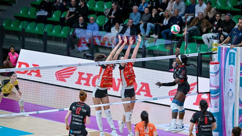 Avvio del primo set nel segno del massimo equilibrio. È botta e risposta tra Diop e Williams, entrambe in grande serata. Il primo allungo porta la firma delle ospiti che restano sempre avanti (massimo vantaggio sul 13-17) ma ancora una volta, come già contro Monviso, il primo set si risolve ai vantaggi. Grandissimo recupero delle «gatte» che, con 3 punti di fila di Pritchard, mettono «la freccia» per il primo vantaggio. Finale sul filo dei nervi. Mazzaro e Williams riportano sopra Perugia che concretizza con il muro punto di Fiesoli su Diop. Il secondo set è un concentrato di emozioni.