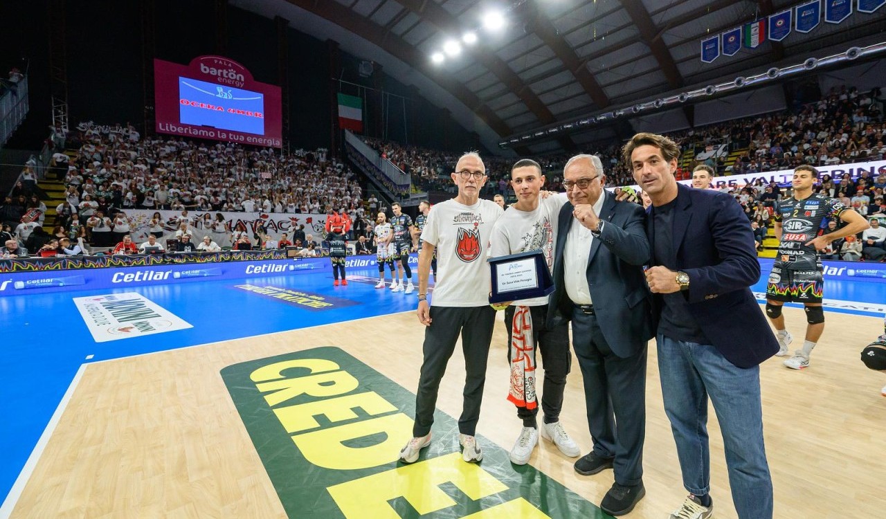 Il palazzetto di Perugia si è vestito a festa, con un suggestivo gioco di luci che ha accompagnato l’ingresso in campo del sestetto bianconero e il pubblico delle grandi occasioni, migliore d’Italia, come sancito dalla Lega Pallavolo serie A che ha assegnato proprio alla tifoseria di Perugia il titolo di “Pubblico più corretto d’Italia”. Hanno ritirato il riconoscimento, direttamente dalla mani del Presidente di Susa Spa, Flavio Cecchetti e dal Direttore Commerciale marketing di Scai, Lorenzo Cesaretti, due rappresentanti della tifoseria bianconera, Donatello Baldella per i Simaniaci e Samuele Billorosso per la curva Nord. E la grande simbiosi della tifoseria con il club si conferma anche nel “secondo atto” di questa premiazione: in occasione del nuovo match casalingo dei Block Devils, in programma mercoledì sera con Padova, i tifosi riconsegneranno il premio nelle mani del Presidente Gino Sirci, per suggellare la volontà condivisa che la targa resti nel quartier generale della società bianconera, insieme agli altri trofei conquistati nel corso di questi anni!