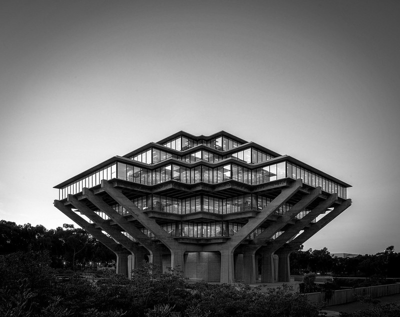 Il progetto, a firma di William Pereira, si colloca a metà strada fra Brutalismo e Futurismo, una posizione che l’architetto perseguì per tutta la vita. Completata nel 1970, la biblioteca è spesso descritta come due mani che reggono una pila di libri, ma la sua forma – pioneristica nel panorama architettonico di quegli anni – è paragonata anche a quella di un’astronave, riflettendo la fascinazione del periodo per il progresso tecnologico e i viaggi nello spazio. Il design è infatti geometrico e scultoreo, con pilastri in cemento grezzo protesi verso l’esterno e la facciata che cambia da un piano e da un lato all’altro. Metafora visiva della ricerca della conoscenza, con la sua struttura ascendente che sembra dissolversi nel cielo, la Geisel Library ha ispirato numerosi architetti, influenzando la progettazione di altri edifici pubblici nel mondo. E forse è proprio a lei che ha guardato il designer Luca Pevere per la sua libreria Zinco ideata per Desalto.
