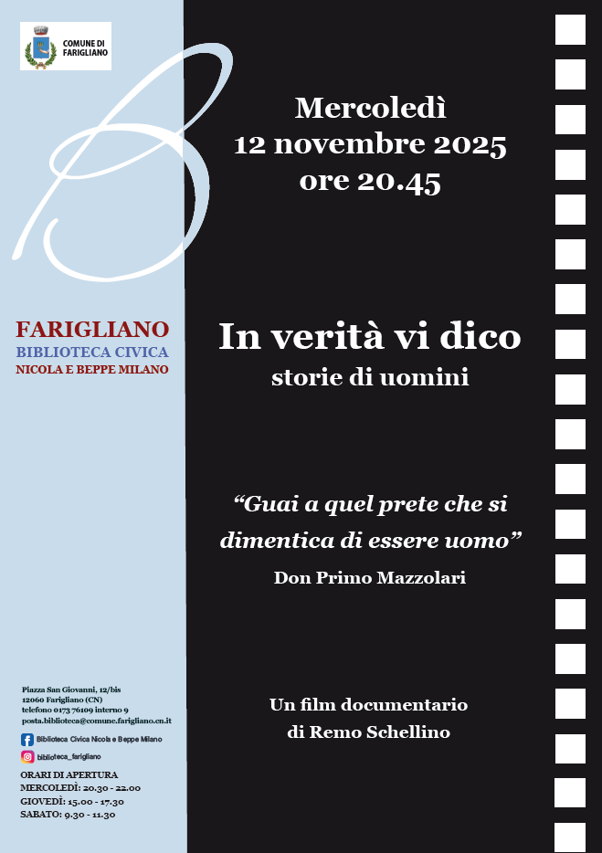 Mercoledì 12 novembre alle ore 20.45 presso la Biblioteca di Farigliano, il regista “di casa”, Remo Schellino presenta “In verità vi dico. Storie di uomini”, film documentario trasmesso in memoria di don Armando Ferreri, già parroco di Farigliano, venuto a mancare nel gennaio 2024.