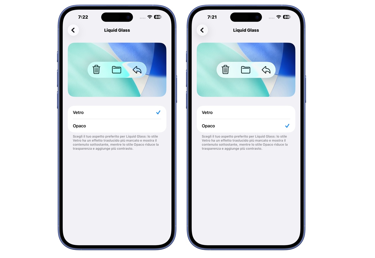 La modalità Vetro mantiene la trasparenza tipica della versione originale di Liquid Glass, mentre Opaco riduce l’intensità dell’effett.