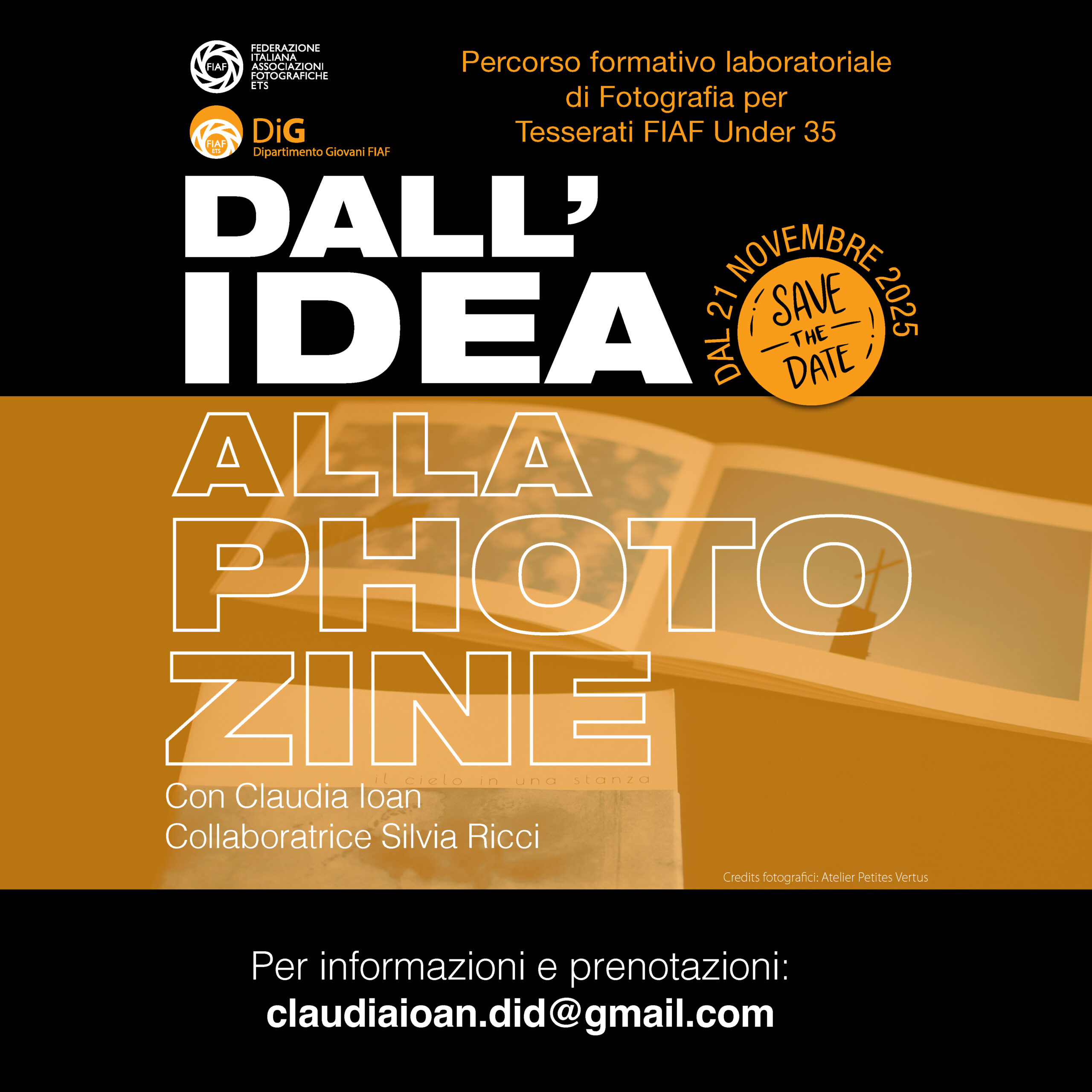 Parte già il 21 novembre 2025 quello del Dipartimento Giovani – DiG – dal titolo “Dall’idea alla Photozine“, a cura di Claudia Ioan con la collaborazione di Silvia Ricci, a tema del Festival della Fotografia Italiana 2026, riservato ai giovani Tesserati FIAF under 35. Per coloro che non sono ancora tesserati alla FIAF, sarà possibile iscriversi a tariffa agevolata (primo tesseramento assoluto).