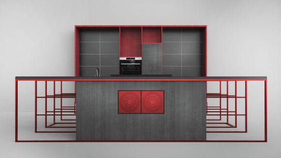 Sullo sfondo una parete con dispensa ed elettrodomestici. Approccio cromatico ovviamente a richiamare la firma rossa di AEG.