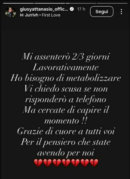 Per elaborare il lutto, Giusy ha annunciato che si prenderà qualche giorno di pausa dal lavoro: «Ho bisogno di restare sola con la mia famiglia e metabolizzare questo momento». In poche ore, il post ha raccolto centinaia di messaggi di vicinanza e affetto da parte di fan, colleghi e amici, tutti uniti nel manifestare solidarietà e cordoglio per la cantante.