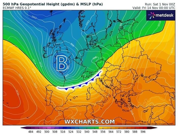 Come possiamo vedere dalla seconda mappa qui sotto permane infatti un’area di bassa pressione sul comparto atlantico; questo significa che a più riprese arriveranno perturbazioni cariche di piogge fin sul bacino del Mediterraneo. La prima delle quali dovrebbe colpire l’Italia intorno al 14-15 del mese, dando il via ad un peggioramento importante su molte delle nostre regioni.