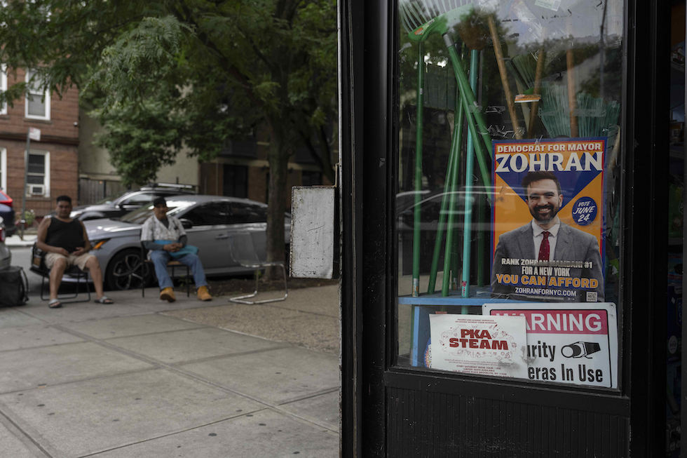 Ma Bhoopathy ha preso in considerazione anche altri rimandi visivi, come il giallo e il blu dei biglietti della metro, e soprattutto l’estetica tipica delle bodegas, i piccoli negozi di quartiere spesso gestiti da famiglie di latinos, riconoscibili per le insegne coloratissime, le luci al neon, i cartelli dipinti a mano e le facciate piene di scritte: luoghi che, nelle ultime settimane, Mamdani aveva frequentato spesso.