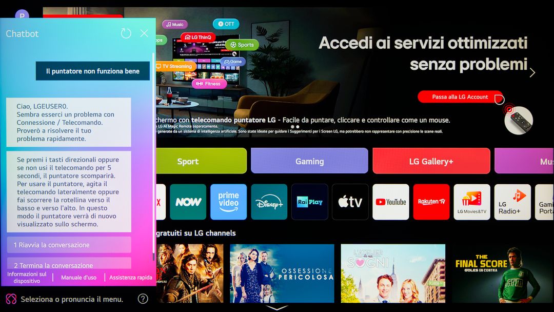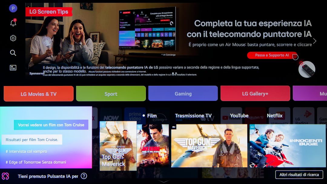 In Italia troviamo in dotazione ancora il telecomando a puntatore con il layout con tastierino numerico e il nuovo tasto AI al posto del microfono.Con WebOS 25 funzioni ultra complete