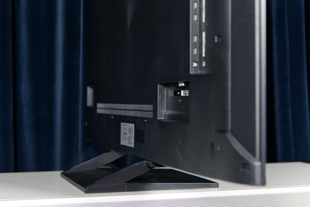 Il TV è molto leggero e la plastica regna sovrana, soprattutto sul pannello posteriore, ma anche sulla copertura piedistallo. Quest’ultimo si distingue per le due staffette che si alzano dalla base e che sostengono lo schermo. Vanno avvitate sul bordo inferiore del televisore, il che implica che durante il montaggio il TV va per forza sdraiato, operazione da svolgere con delicatezza per evitare di danneggiare lo schermo.