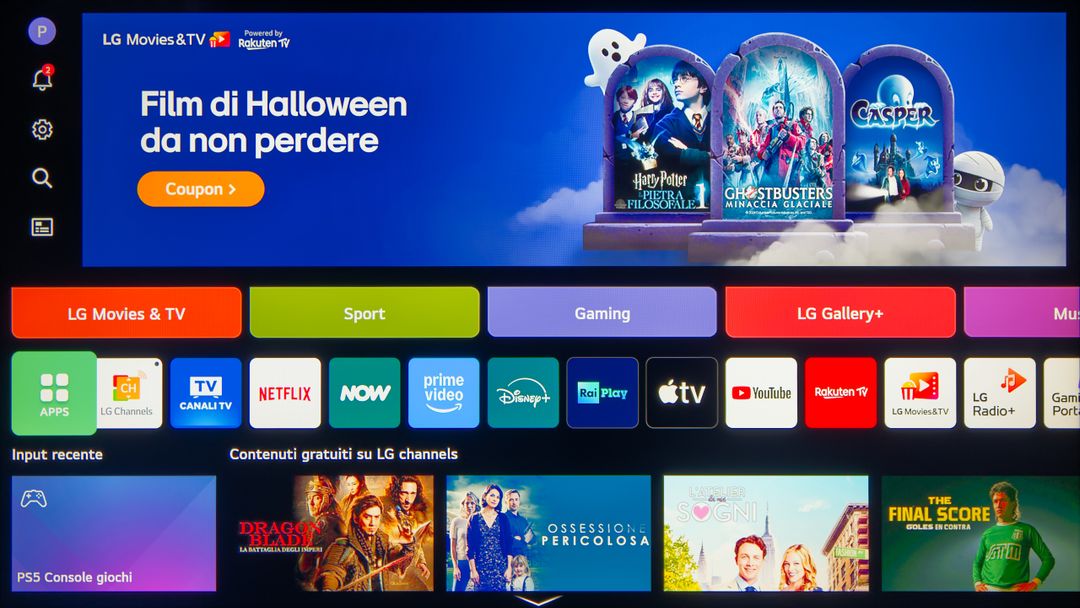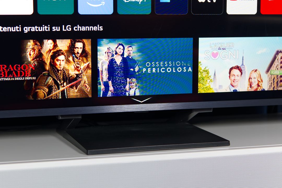 Senza infamia e senza lode invece la sezione audio. La risposta in frequenza non è molto profonda ed è leggermente sbilanciata sui toni medi. La modalità AI Sound Pro virtualizza l’emissione dei due canali fisici stereo a 9.1.2 canali secondo la descrizione di LG, ma l’effetto è soprattutto quello di un allargamento del fronte sonoro, che riesce in effetti a valicare i confini fisici dello schermo, più che un vero effetto di coinvolgimento.
