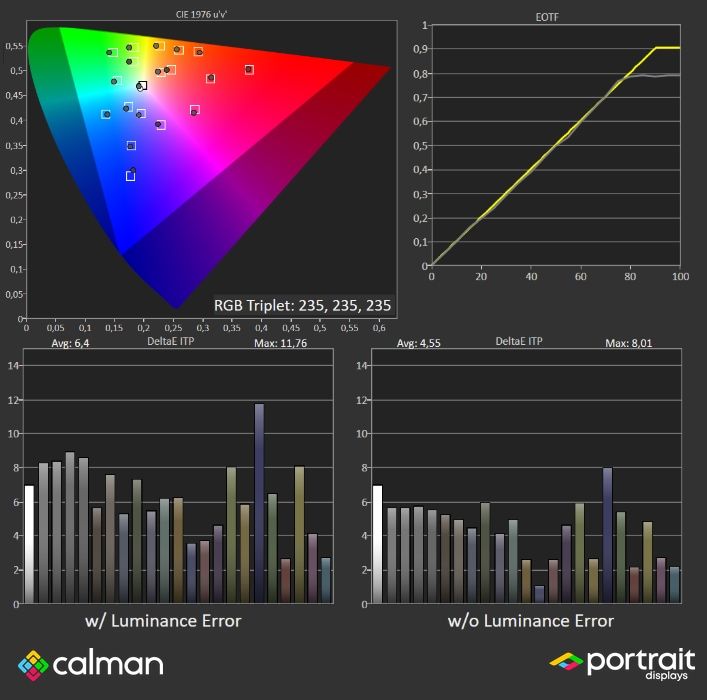 Calibrare manualmente il TV QNED93 non è semplice perché il sistema di local dimming interagisce con i pattern a seconda del livello medio di luminosità distorcendo apparentemente la linearità della scala di grigi. Lo stesso AutoCal per i TV LG di Calman di Portrait Displays non funziona correttamente, portando a risultati peggiori della calibrazione di fabbrica anche seguendo passo a passo tutte le linee guida per il particolare modello, sia in SDR che in HDR. Alla fine ci siamo affidati solo al controllo su due punti del bilanciamento del bianco per compensare la varianza del pannello, ottenendo comunque valori di deltaE medio molto bassi e quel che più importa un’immagine corretta in termini di resa soprattutto sulle basse luci.