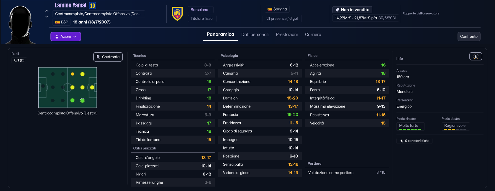 Le caratteristiche di Lamine Yamal, calciatore del Barcellona e della Nazionale spagnola, nel gioco (FM26)