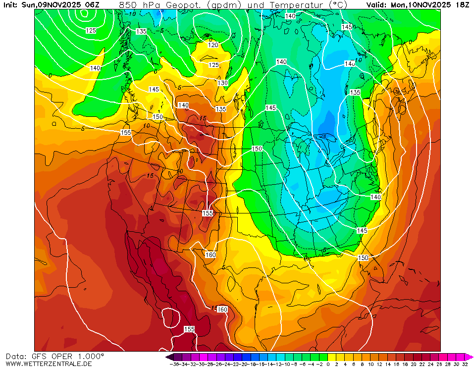 Come vediamo dalla mappa, mentre l’Est lotta con l’arrivo anticipato dell’inverno, la storia è completamente diversa dall’altra parte del paese. Le Montagne Rocciose e la costa del Pacifico vivono giornate limpide, miti, persino calde per la stagione. In alcune località si sfiorano record giornalieri; è come se il paese fosse diviso in due stagioni parallele, separate da una linea invisibile di vento e pressione.