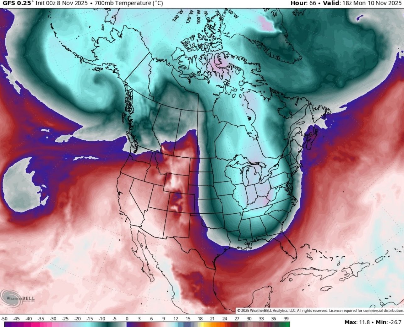 Impressionante la previsione delle temperature per domani sera su tutto il settore centro-orientale (e l’ondata di gelo poi, martedì, si spingerà sulla costa atlantica con nevicate fino a New York!):
