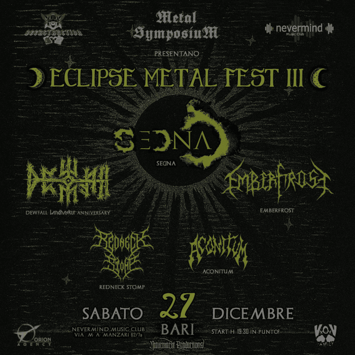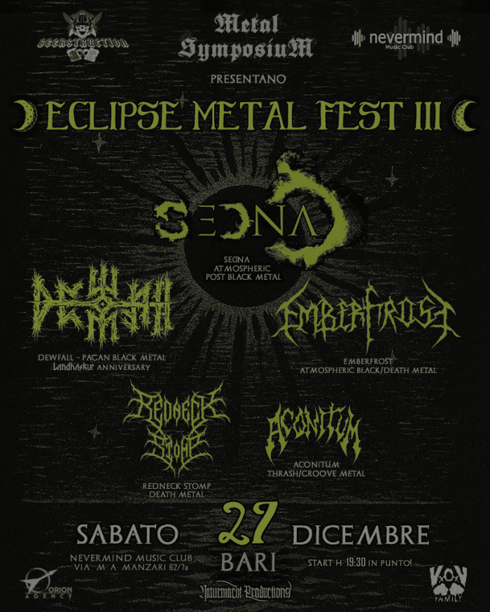 Metal Symposium e Beerstruction presentano la terza edizione dell’Eclipse Metal Fest Winter Edition, in collaborazione con Nevermind Music Club, Orion Agency e Vov Eventi.