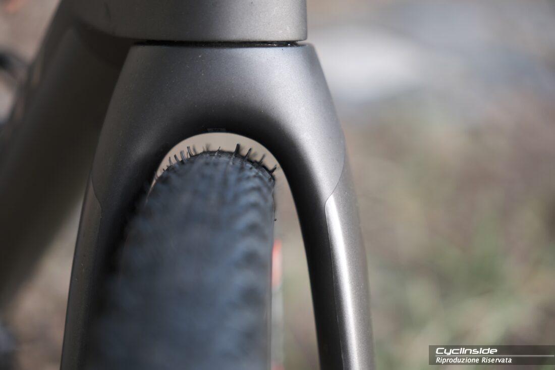 La scelta delle gomme è ricaduta sul modello che meglio incontrava la tire-clearance della bici, ma anche su quello che a livello di tassellatura e di impronta del battistrada meglio ci sembrava assecondare la natura di una bici che non è certo una gravel nativa, piuttosto è studiata principalmente (ma non esclusivamente) per l’asfalto.