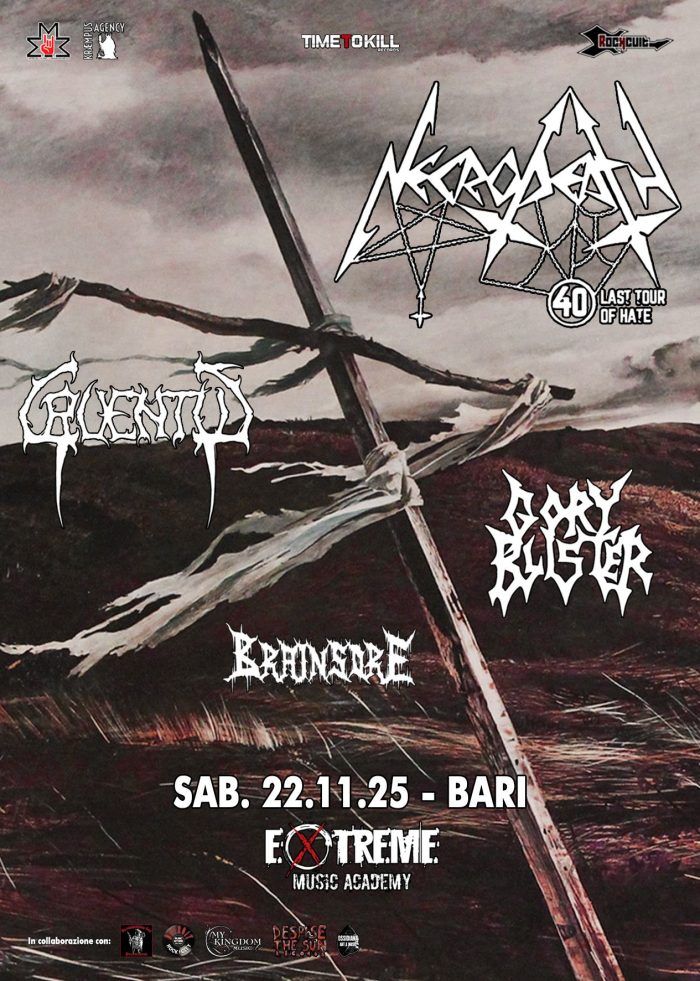 L’iconica band NECRODEATH arriva in Puglia per una serata esclusiva del loro ultimo tour. Flegias, Peso, Pier e Gl daranno vita a uno show devastante, ripercorrendo una carriera lunga 40 anni prima di salutare definitivamente i fan.