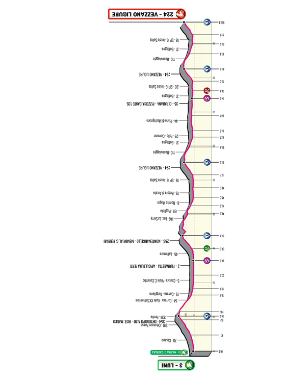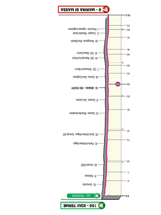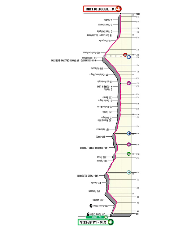 «L’ultima tappa partirà da La Spezia – conclude Alessandro Colò – esattamente dallo stadio dello Spezia Calcio, il Picco. Il gruppo uscirà in direzione Volastra e prenderà la Strada Provinciale 51 e attraverserà il Parco Nazionale delle Cinque Terre. Una frazione dal profilo mosso fin dai primi chilometri che dopo un primo passaggio sotto al traguardo di Terre di Luni scalerà la salita di Fosdinovo. Un’ascesa di 8 chilometri con pendenze, nell’ultimo chilometro, che arrivano anche al 18 per cento. Si scollinerà abbastanza lontani dal traguardo ma la discesa tecnica renderà difficile il rientro».