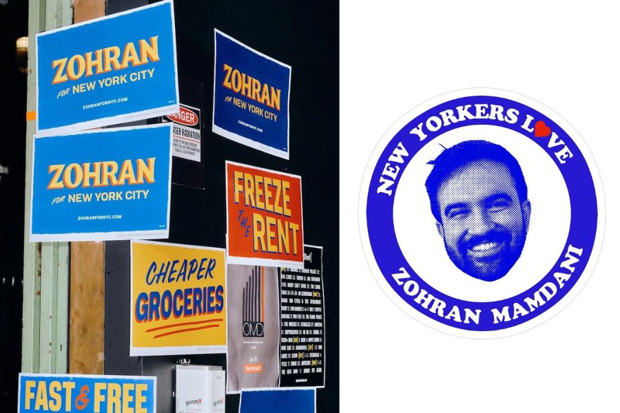 A trasmettere la carica di novità del candidato, e ora prossimo sindaco di New York, Zohran Mamdani hanno contribuito non poco il design e l’identità visiva della sua campagna. Giocata tutta sui toni vibranti del blu brillante, del giallo senape e del rosso, era distante anni luce da quelle tradizionali, sia di parte democratica che di parte repubblicana, caratterizzate da colori piatti, blu e rosso d’ordinanza, font senza grazie, foto-santino praticamente indistinguibili. Se invece togliessimo il nome e il viso di Mamdani, quell’identità visiva li richiamerebbe istantaneamente.