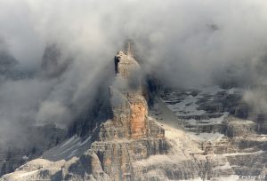 Campanile e Cima Val di Roda, nelle Pale di San Martino. L’alternarsi di nebbia e cielo, rende l’estetica delle montagne sempre diversa, celandone una parte o rivelandone un’altra, nel giro di pochissimo tempo, a volte anche secondi: un vero “parco giochi”, per il fotografo che può scattare in velocità, ottenendo risultati sempre diversi. Fujifilm XT 3; XC50-230mmF4.5-6.7 OIS; 1/300 sec; f/8; ISO 400