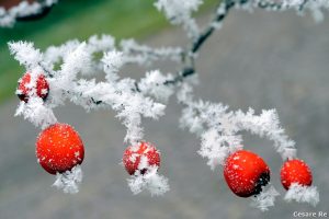 In inverno, si pensa sempre alla neve come elemento caratteristico del paesaggio, oppure alla presenza di nubi o nebbia. Pure la galaverna, però, può dare spunti notevoli, anche perché è un elemento che non si verifica di frequente. La temperatura deve essere molto bassa, con un tasso umidità piuttosto elevato: piante, foglie, bacche e cortecce si adornano di caratteristiche forme bianche, in verità piuttosto effimere. Si scatta, infatti, poco dopo il sorgere del sole, altrimenti il susseguente aumento della temperatura annulla l’effetto bianco, così peculiare.