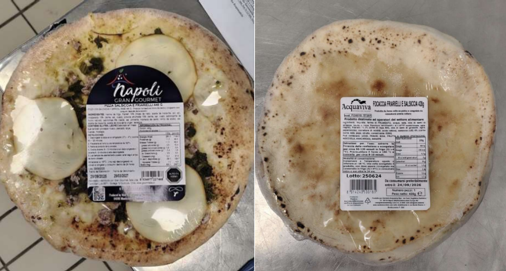 - Focaccia friarielli e salsiccia Acquaviva, venduta in confezioni da 420 grammi, con i numeri di lotto 250624 e 250721 e la data di scadenza 24/09/2026 e 21/10/2026.