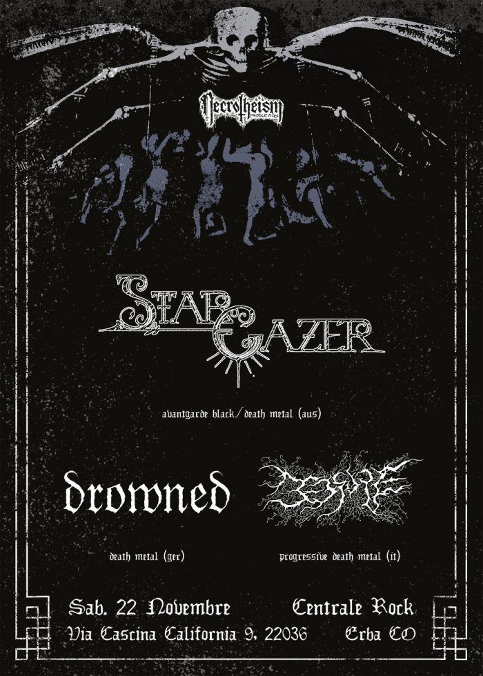 In vista del prossimo weekend, Necrotheism Prod. rende noti tutti i dettagli della data di questo Sabato 22 Novembre al Centrale Rock Pub di Erba, con l’unica apparizione italiana degli australiani STARGAZER (Nuclear War Now! Productions), dal 1995 punto di riferimento della scena avantgarde black/death metal riff.