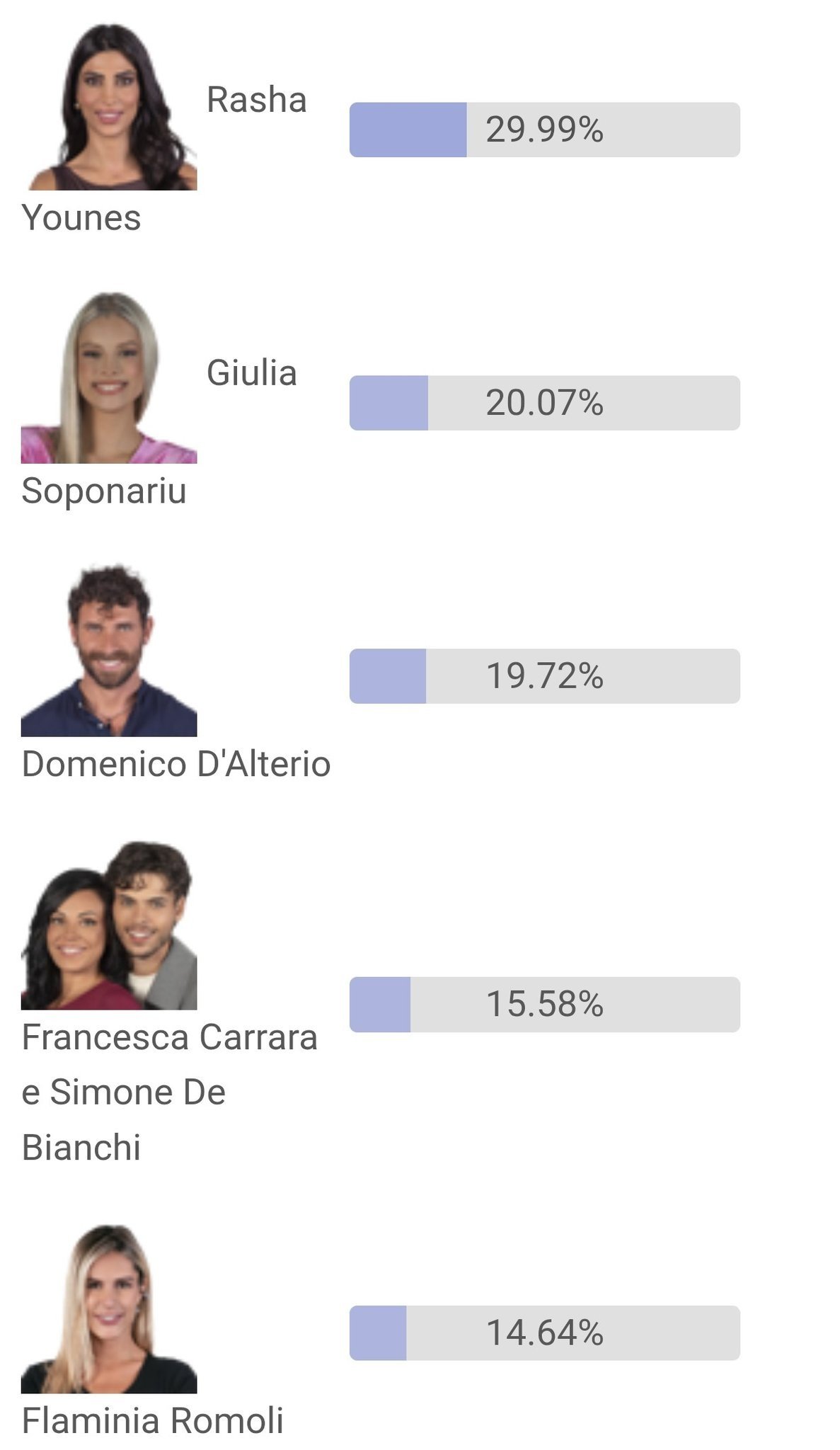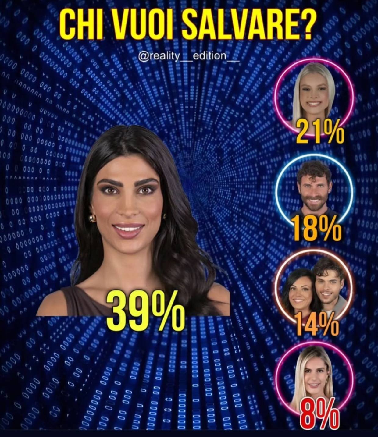 Sul Reality Edition, Alla domanda chi vuoi salvare, al primo posto si posiziona Rasha con il 39%. Al secondo posto, Giulia con il 21% e al terzo Domenico con il 18% e al quarto Francesca e Simone con il 14% e al quinto Flaminia con l’8%