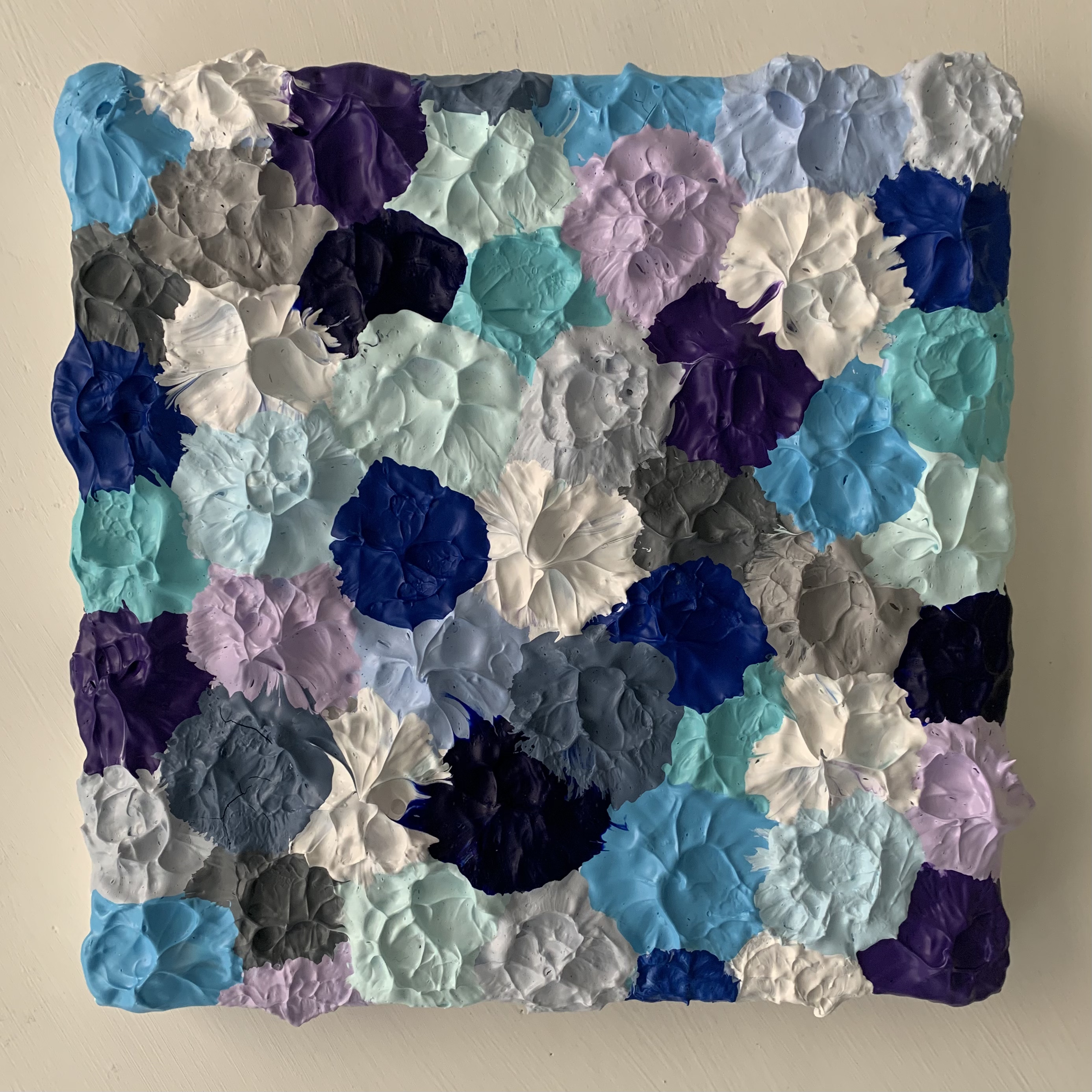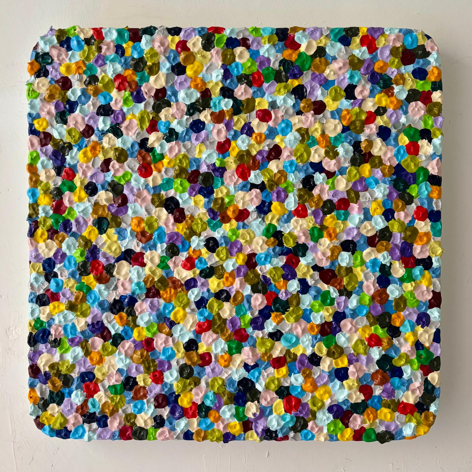 Nella serie Dandelions l’artista si ispira al soffione che si disperde al vento. Questa evoca la forza vitale che si libera nello spazio. Le macchie di colore si dilatano in forme leggere e diffuse, segni di un’energia che si rinnova e si moltiplica, come un respiro collettivo. La selezione delle opere è coerente con lo spazio che ospita la mostra, infatti la dimensione delle stesse è di massimo 50×50 cm.