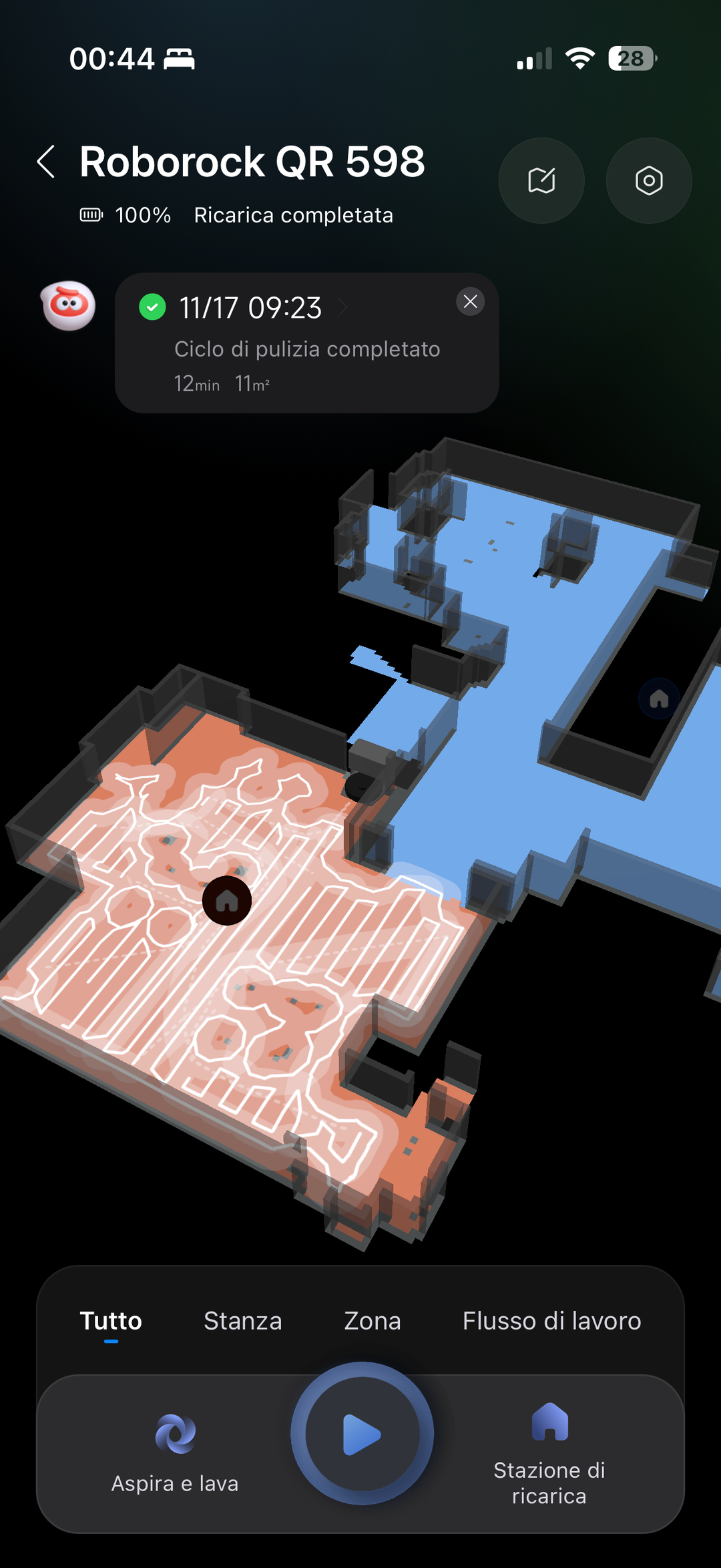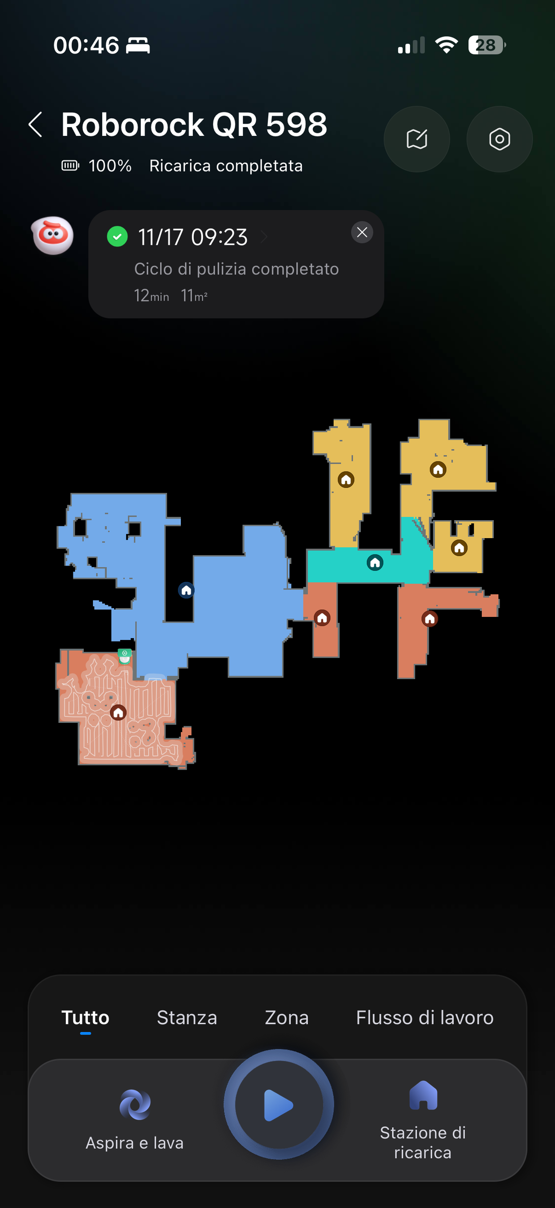 Il funzionamento è facile: si sceglie la modalità di pulizia (solo aspirazione, solo lavaggio, aspira e lava), le intensità di aspirazione e lavaggio, il numero di passate e altri parametri; si seleziona poi se applicare l’intervento su tutta la casa, solo su alcune stanze o su zone specifiche (dove per esempio può essere caduto qualcosa e serve pulire), facilmente configurabili sulla mappa. E infine si preme “play” per far partire l’intevento.